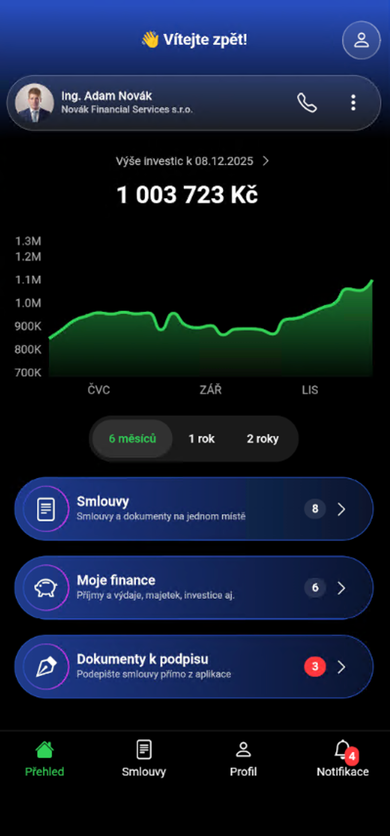 Mobilní aplikace Poradce v apce umožňuje přístup ke všem smlouvám, dokumentům a investicím na jednom místě, s přehledným a bezpečným prostředím. Zjednodušuje komunikaci s poradcem, nabízí digitální podpisy a ucelený pohled na finanční situaci.