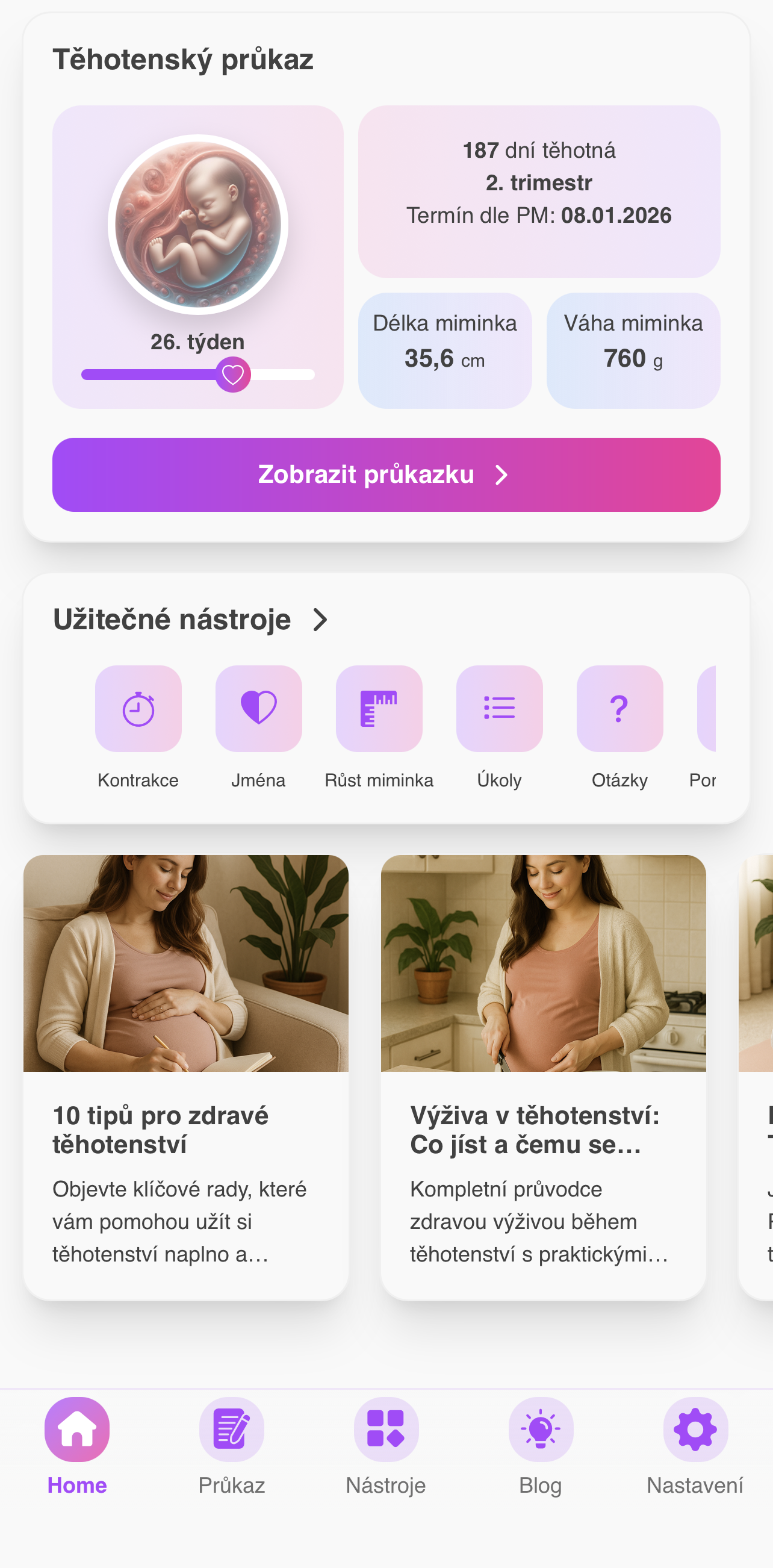Aplikace Těhotenský průkaz přináší digitální verzi papírové průkazky pro těhotné ženy. Umožňuje přístup k informacím o těhotenství, kontrolách a vyšetřeních, zjednodušuje komunikaci s lékařem a nabízí funkce podpořené AI.